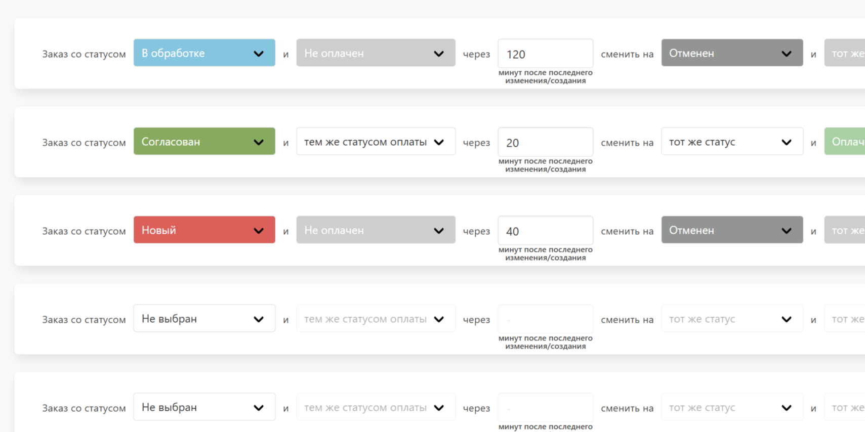 - Отсчет времени: От создания заказа или последнего изменения